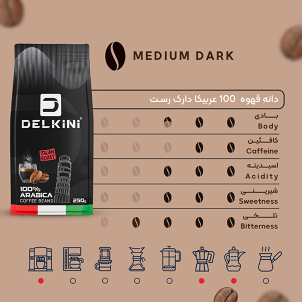 | ویژگی | ایتالین روست, طعم تلخ, کافئین کم, مناسب برای اسپرسو و موکاپات |