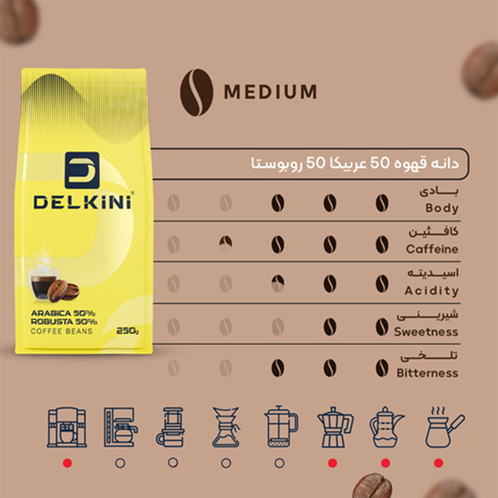 قهوه 50 % عربیکا و 50 % روبوستا دلکینی با ردپای قدرتمند روبوستا در هر فنجان، تجربهای به یادماندنی را نوید میدهد. تلخی نسبتا بالایی دارد و شیرینی ملایمی در آن پنهان شده است.