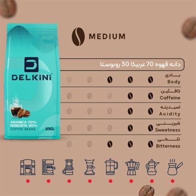 قهوه هفتاد سی عربیکا دلکینی، به دلیل انعطافپذیری فوقالعاده خود، با انواع روشهای دمآوری سازگار است.